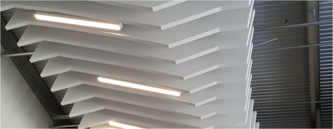 The Plano Baffles are made from lightweight, Class A Fire Rated foam. They come in natural White or Grey foam that is easy to work with and safe for any commercial environment. They can also be custom painted as needed